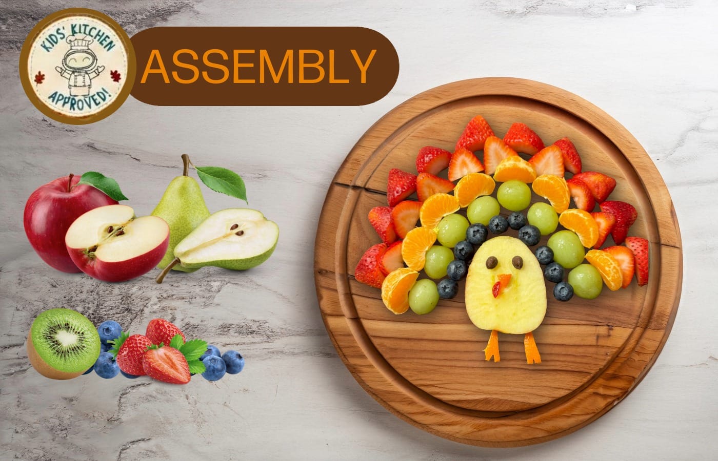 - Feather Fluffing: Help your child arrange the fruit slices in circles to make the big, beautiful tail feathers. Starting from the outside, arrange red fruits or veggies around an apple or pear half. Moving inwards, add more colors.